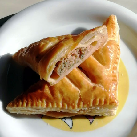 | 皮は市販のパイシートを使います。餡は豚挽き肉とキャベツ、竹の子を使います。 |